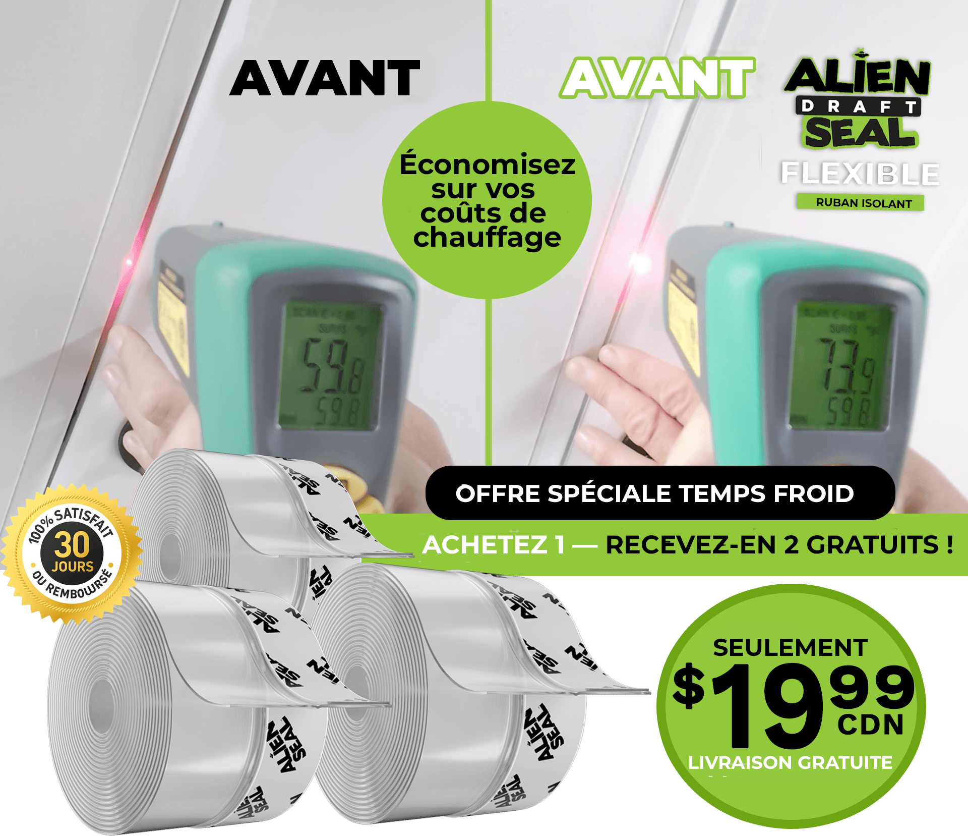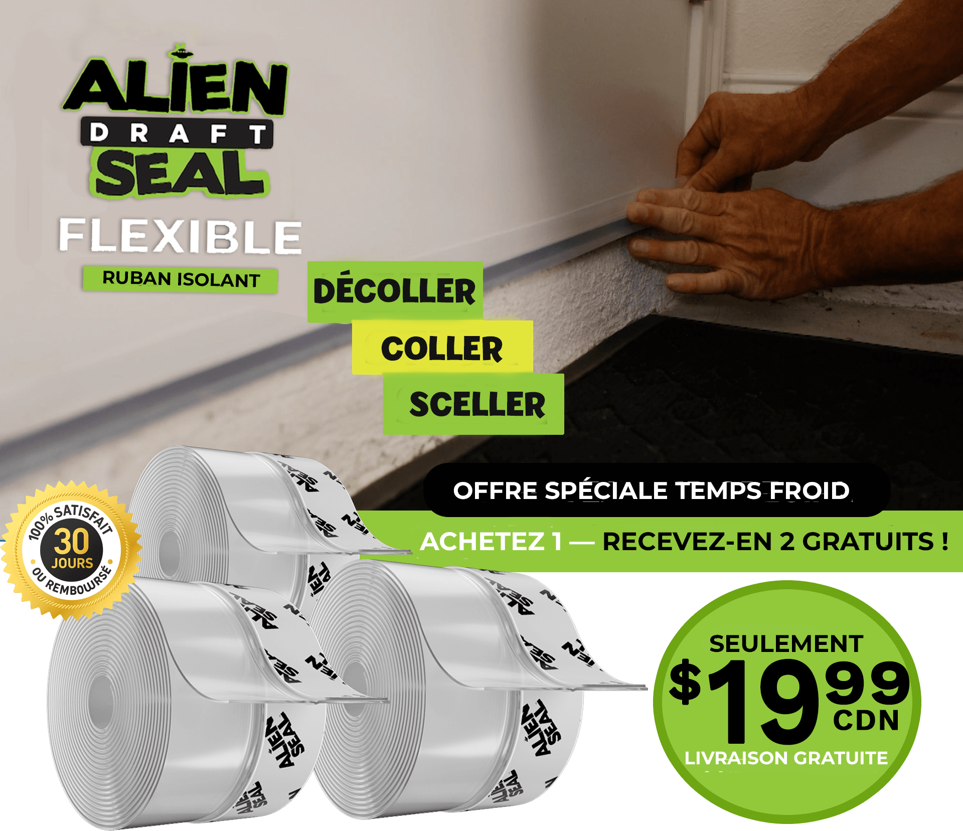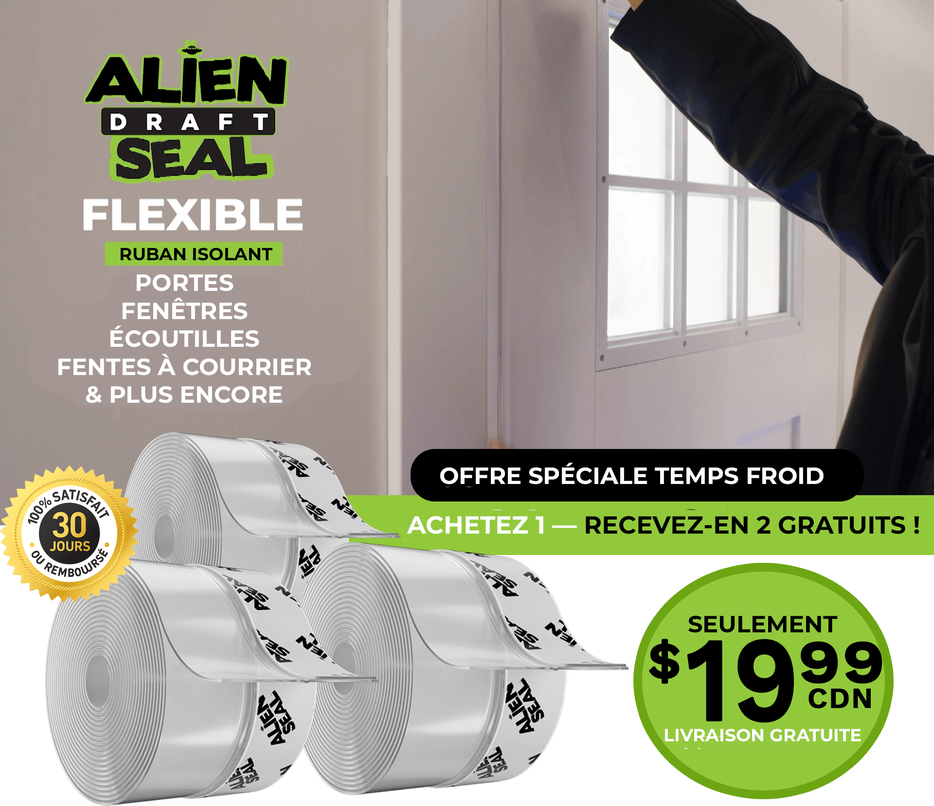 Nous proposons le mastic Alien Draft Seal directement aux consommateurs. Vous ne trouverez pas Alien Draft Seal enmagasin ! Et n'oubliez pas : pour l'achat d'UN seul rouleau d'AlienDraft Seal aujourd'hui, nous vous offrons DEUX ROULEAUX ! Vous recevrez 3rouleaux pour seulement 19,99 $ + LIVRAISON GRATUITE !